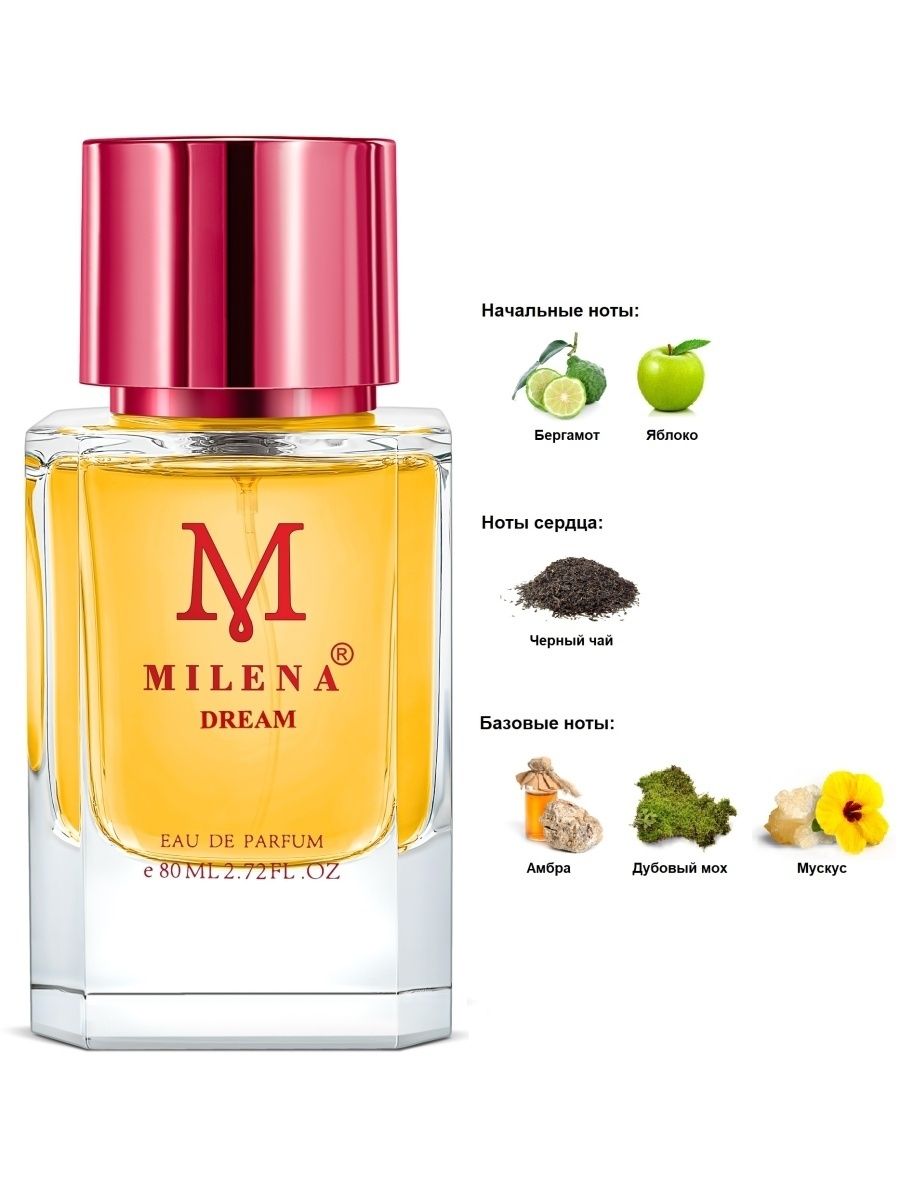 Фужерное звучание нежного аромата Milena Dream сумеют оценить по достоинству привлекательные, стильные, мужественные джентльмены и женственные, миловидные, очаровательные леди. С ним можно смело отправляться на важное собеседование, неформальную, дружескую встречу за чашечкой горячего чая или страстное свидание в вечернее время суток. Свежесть зеленого бергамота выступает в удачном сочетании с фруктовыми аккордами спелого, сочного яблока. Благоухание свежезаваренного черного чая отборных сортов раскрывается в сердце парфюмерной композиции. Опьяняющий дубовый мох гармонично сочетается с заманчивой черной амброй, создавая невидимый, но насыщенный и долгоиграющий шлейф. Соблазнительный мускус расставляет окончательные штрихи в незабываемой картине.