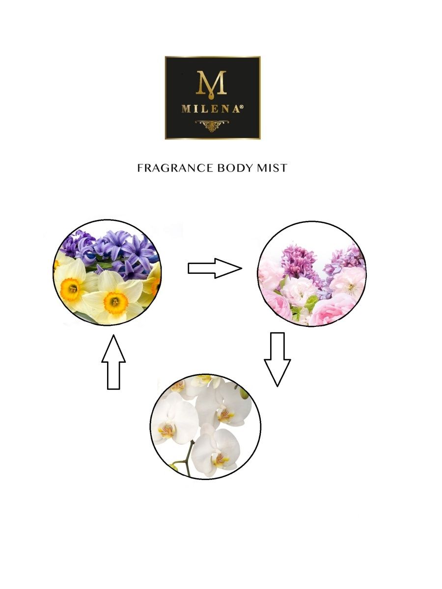 Milena Parfum представляет коллекцию освежающих, увлажняющих и тонизирующих спреев, которые смягчают кожу благодаря содержанию питательных растительных масел и дарят телу легкую ароматную вуаль. Чувственный и соблазнительный спрей-мист наполненный ароматами сладких цветов. Со временем аромат не теряет своей яркости.  Средство не оставляет следов на одежде, никакой липкости и тяжелого шлейфа. В состав миста входят компоненты, которые бережно ухаживают за кожей, оказывая успокаивающее и смягчающее действие.